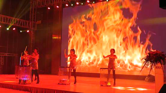年會開始在下午2點(diǎn)整,隨著陳總簡潔的開幕詞,《中國龍》水鼓舞點(diǎn)燃了現(xiàn)場火烈的氣氛,那激情四射的水花隨著燈光變換出五顏六色的光,動感的節(jié)奏,成為晚會一個紅紅火火的開始。
