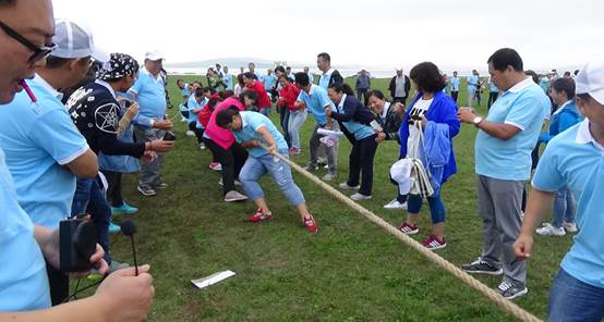 草地松松軟軟,正是舉辦活動(dòng)的好去處。全體動(dòng)員,場(chǎng)面激烈,是拔河比賽的熱火朝天,還是十人九足的齊心協(xié)力,不管是鏈接加速的步調(diào)一致,還是連環(huán)協(xié)作的團(tuán)隊(duì)配合,一個(gè)個(gè)游戲充分調(diào)動(dòng)了大家的積極性,帶出的熱情連周圍的羊兒都感受到了,不斷發(fā)出咩咩的叫聲。大家在這藍(lán)天綠草之間,展開(kāi)配合,展開(kāi)競(jìng)爭(zhēng),每個(gè)人都參與其中,每個(gè)人都開(kāi)心的笑著…過(guò)后,大家來(lái)到盛放烤羊的蒙古包,體驗(yàn)了鄂倫春式的手扒羊肉,蒙古族的姑娘小伙子更是獻(xiàn)上了歌曲舞蹈及長(zhǎng)調(diào)為喝酒助興,歡歌笑語(yǔ)飄散在草原之上,直到很遠(yuǎn)。